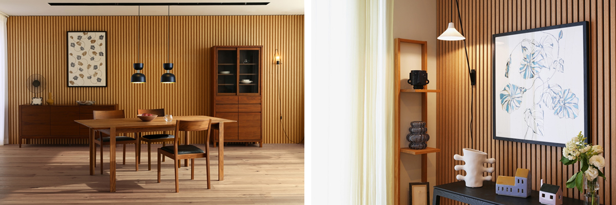 ショールームや展示会で使用していた壁材でしたが、お客様からの問い合わせが多かったため、2024年に商品化しました。それから徐々に売り上げが伸びてきて、この度、堂々10位にランクインしました。高野木工のRIB PANELは、幅90cm、高さ240cmの固定サイズで、シンプルタイプとデラックスタイプの2種類あります。また、エンドパネルや幕板、カット対応など、きれいに納める工夫がされています。一般住宅の玄関やリビングのアクセントとしての利用が多いです。