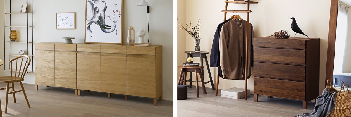 高野木工は、1942年に箪笥メーカーとして創業しました。長年タンスを作り続け、箱物家具や引き出しを作る技術は今も受け継がれています。総合家具メーカーとなった現在でも、衣類収納のシリーズが売り上げ上位にランクインするのは、長年の技術の継承によるものです。チェスト・ワードローブ共に良く売れています。