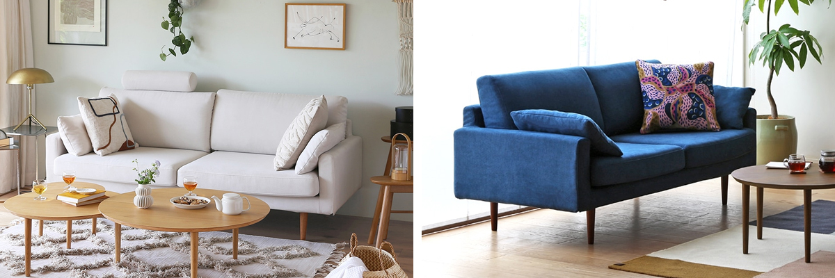 円錐形のシャープかつ絶妙な高さの脚と、座面の厚みや癖のないボディのフォルムが絶妙のバランス。ソファを探しているお客様から、「イメージ通り」という言葉を何度聞いたか分かりません。まさにイメージ通りのソファで、価格はイメージより少し低めなのも人気のポイントです。座面の硬さは思ったよりも若干固めですが、これぐらいがヘタリにくそうで安心感があります。