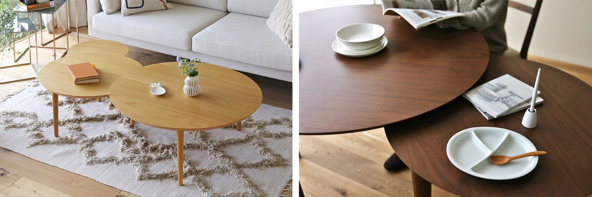 円形のスライド伸長式テーブル「BALLOON」。かわいらしい形状、機能性、見る人を喜ばせるハッピーデザインを具現化したようなテーブルです。発売以来、たくさんの人に愛されていて、高野木工もこうありたいと願いロゴマークにも採用しています。後発のダイニングテーブルも人気です。