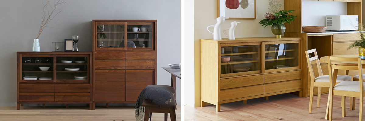 味わいのある食器収納家具として、キッチンスペースでも、リビングルームでも活躍する「CANO」シリーズ。高野木工らしいキッチン収納家具として不動の地位を築いています。