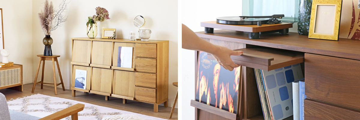 最近古い家からレコードを見つけ、聞けるようにしたのですが、レコードの収納に悩んでいました。レコード収納でデザインの良い家具はなかなかないので、良いものが見つかったと思いました。とても満足です。