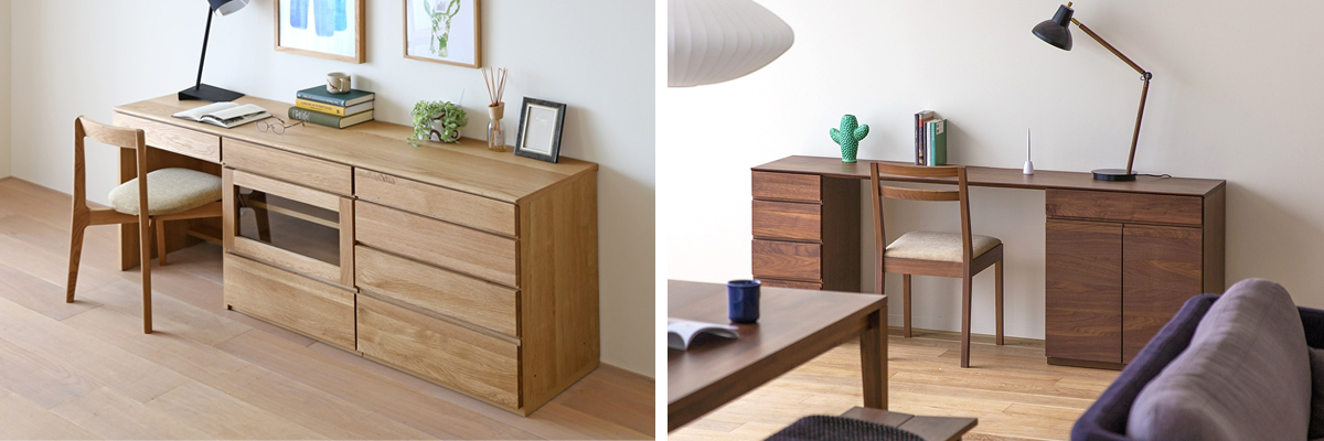 小学生になった子供の学習机としてアスター60デスク、30チェスト、30キャビネットの組み合わせで購入しました。子供部屋ではなくリビングに置きたかったため部屋の圧迫感を考慮してなるべく奥行きの浅いものを探していたものの、あまり魅力的な質感のものがなく困っていたところに本商品を見つけ即決しました。組み合わせも部屋のレイアウトに合わせて自由に選べますし、将来的に個室に移した際のことを考えて天板を90+30にしたりと自由度の高さが魅力でした。実際に届いた商品もとても丁寧な仕上げで、引き出しの出し入れの滑らかさ、チェストの開閉含めとてもクオリティが高く感じます。正直自分が使いたいほどです。(笑)