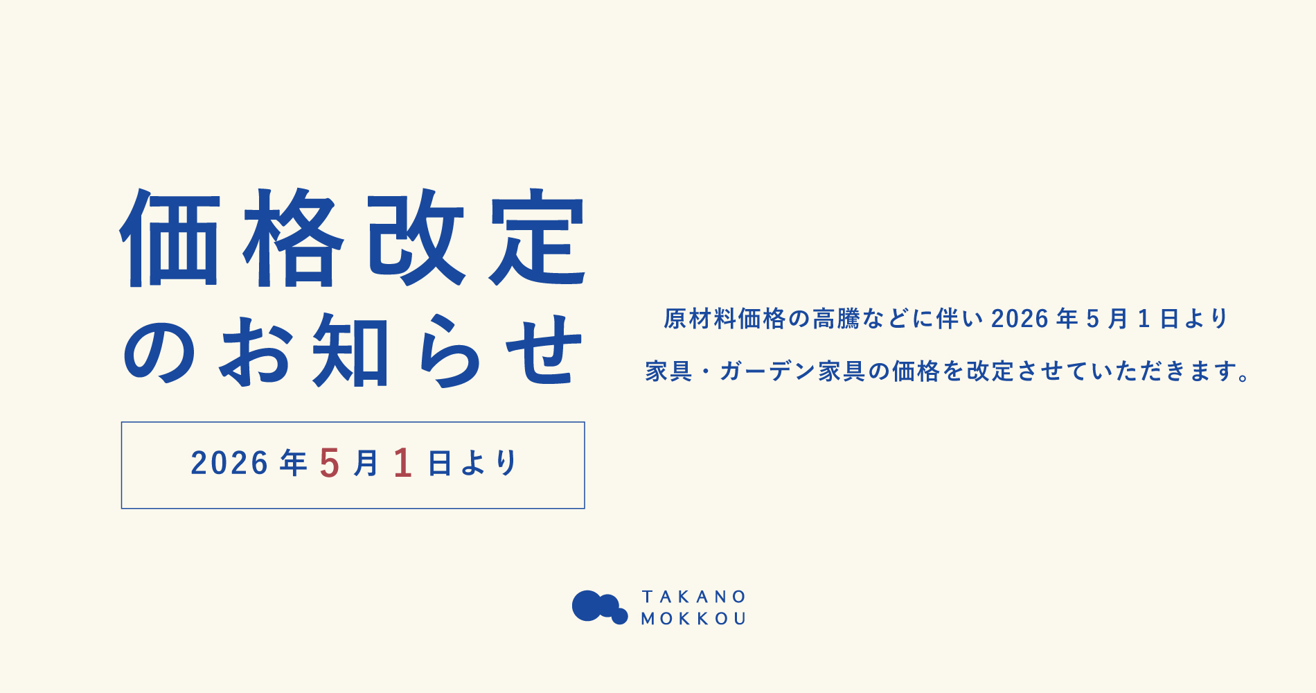この度、誠に勝手ながら、TAKANO MOKKOU(高野木工)の商品につきまして、価格を改定させていただくことになりました。