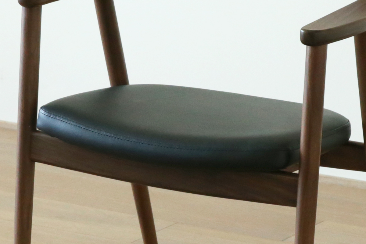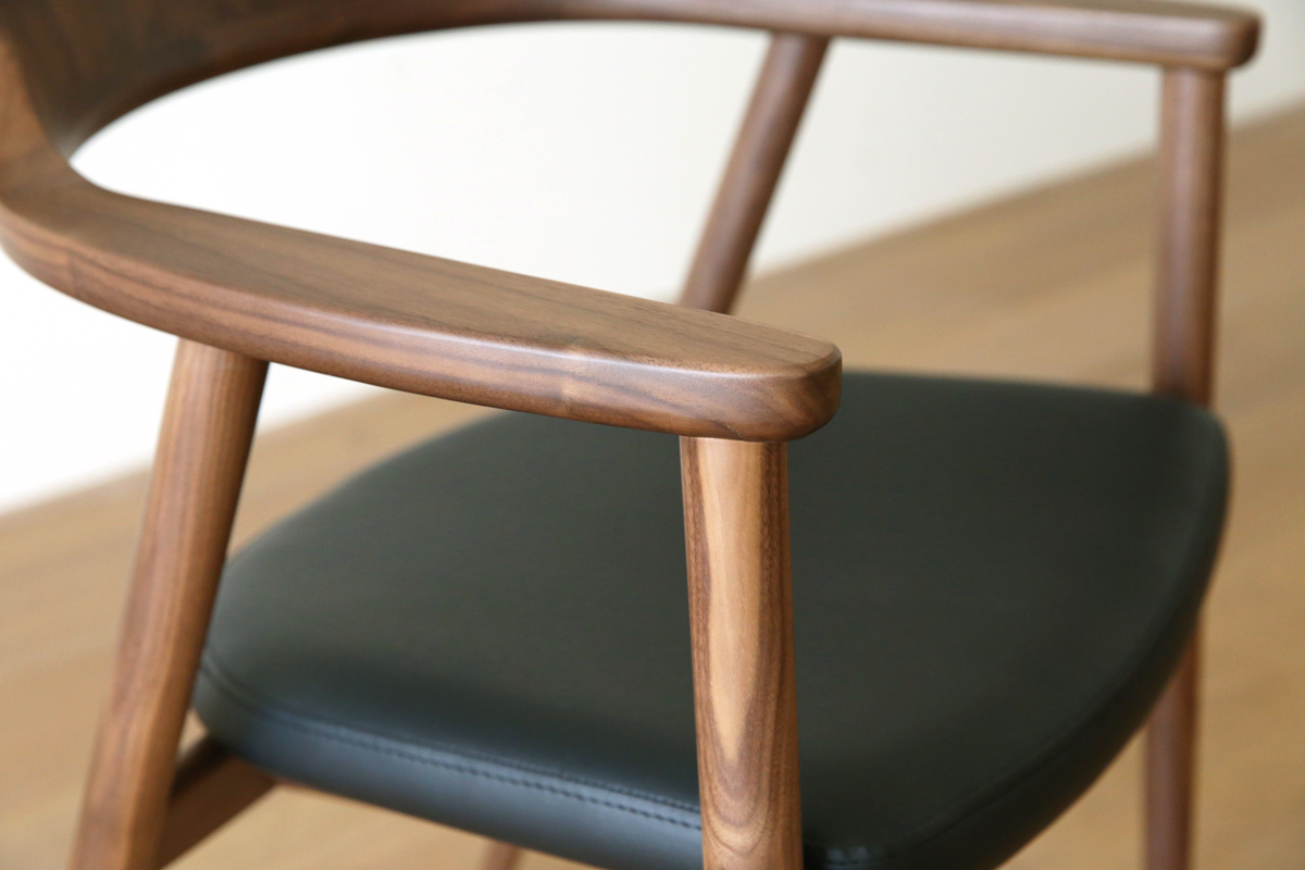 背もたれから流れるように伸びたアームレスト。上下面はストレートに、先端は丸みを帯びさせており、角がとがらないように「面取り」加工も施しています。ひじ掛けがあることで、広い座面と相まって、リラックス感のある座り心地を味わえます。