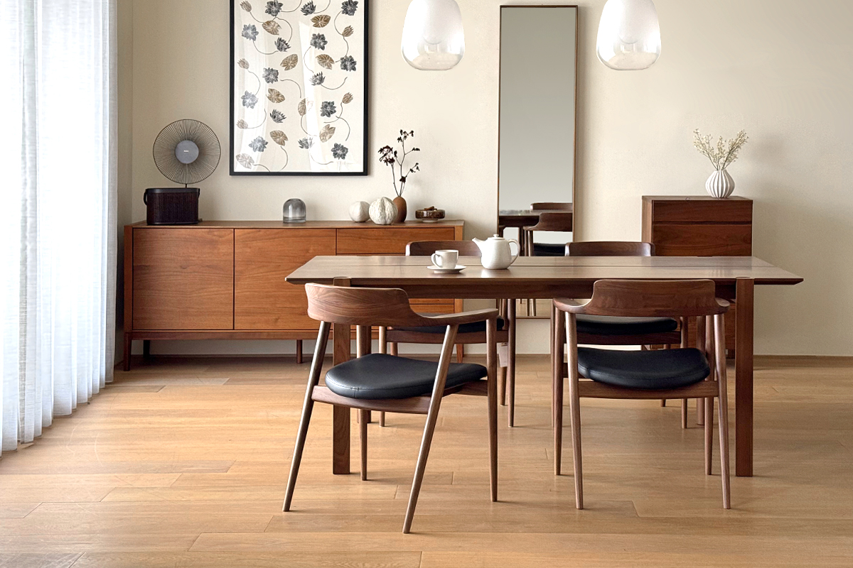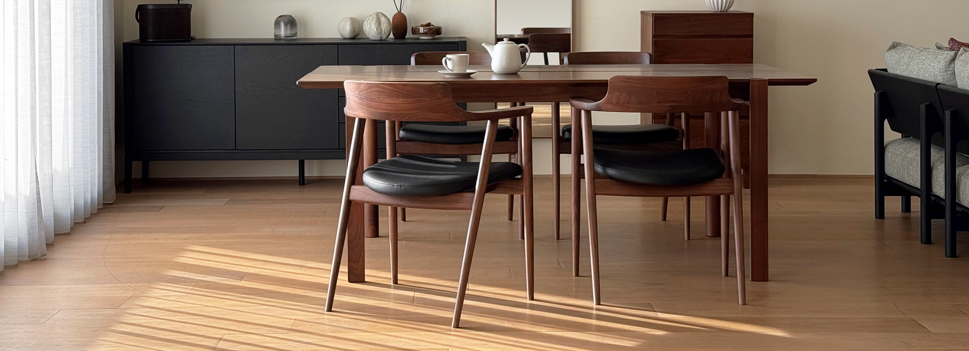 背もたれには、R20の緩やかなカーブを採用。背中のラインに寄り添う、自然なフィット感を生み出します。無垢材を丁寧に削り出された背もたれは、手に触れたときのなめらかさが魅力。「長時間でも疲れにくい、くつろぎ寄りの姿勢」をつくるとされる105度の角度が、体を自然に預けられる心地よさをもたらします。