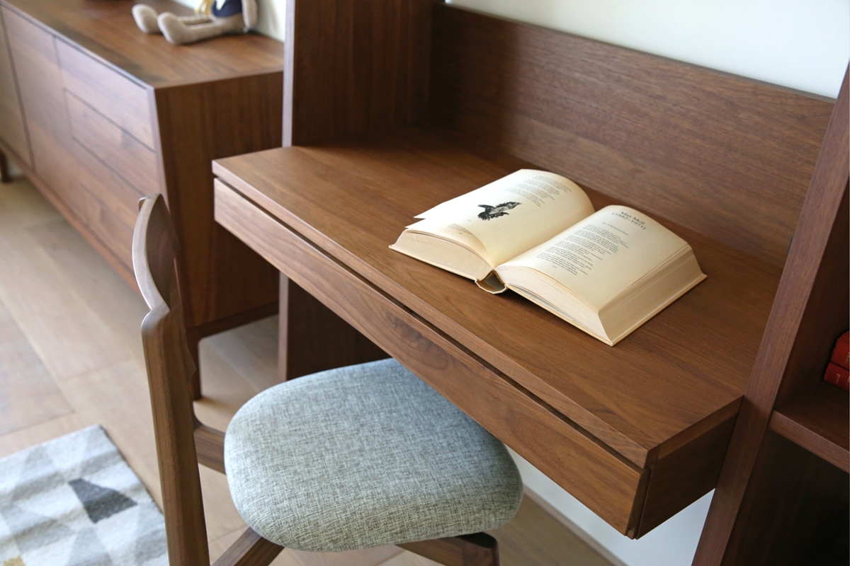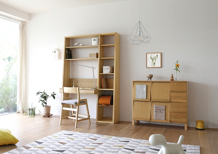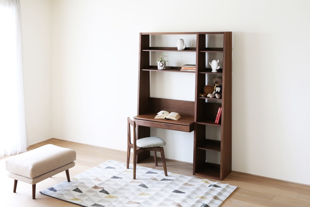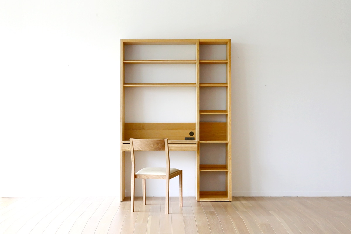 凛としたフォルムが美しいユニットタイプの書棚とデスク。インテリアをかっこよく飾る洗練されたおしゃれな空間を演出します。