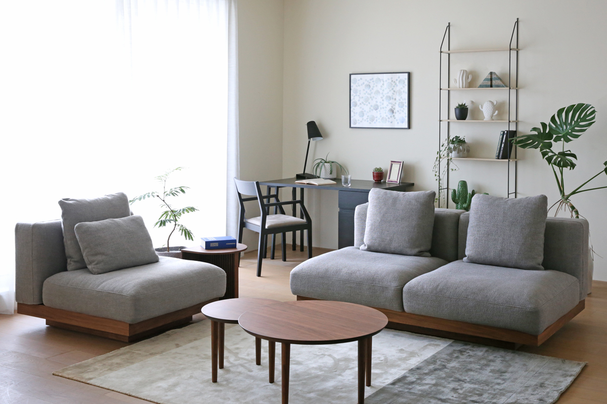 座面を最大に広げるために、肘掛けのない仕様に仕上げました。肘掛けがないだけでもすっきり見え、端まで座面として使えるので幅をまるまる使い切ることができます。 また、肘掛けがないことでソファやテーブルを移動せず出入りが行えます。ちょっとした手間を省くだけでも、空間の使いやすさは格段にアップします。