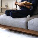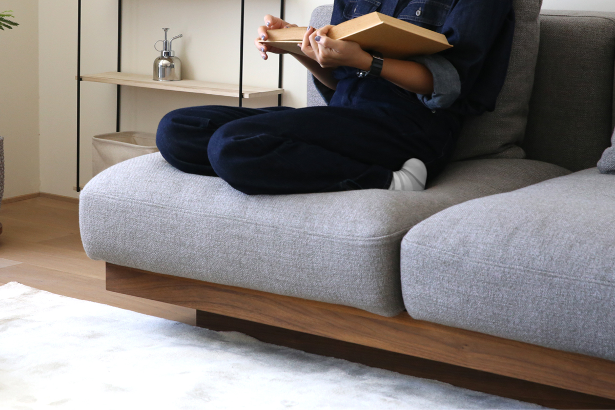 100cmという贅沢な奥行きで、ソファーの上であぐらをかけるほど広々とした奥行き。 背もたれにクッションを複数並べるスタイルでは、体をクッションにうずめる様にもたれることができます。ソファーの座面高と背もたれの高さも低く設計しているため、まるで床に座っているような心地を表現するソファーに仕上がりました。