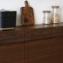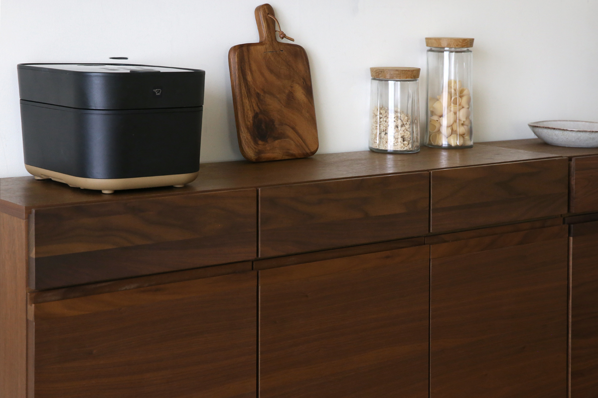 引出しと扉の取っ手部分には彫り込み式の取っ手を採用し無駄な装飾を省き、すっきりシンプルな印象を与えます。 軽く手を掛けるだけでスムーズな開閉が可能です。