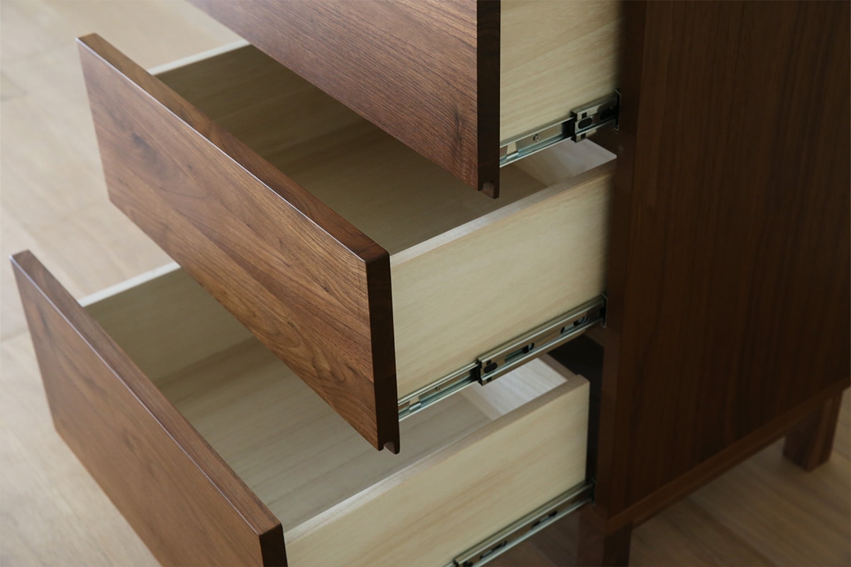 引出しにはフル オープンスライドレールを採用しており、スムーズな開閉が可能です。引出しは丈夫な「箱組み」仕上げです。それぞれ深さの異なる引出しを4杯設けているためさまざまな収納物に対応します。