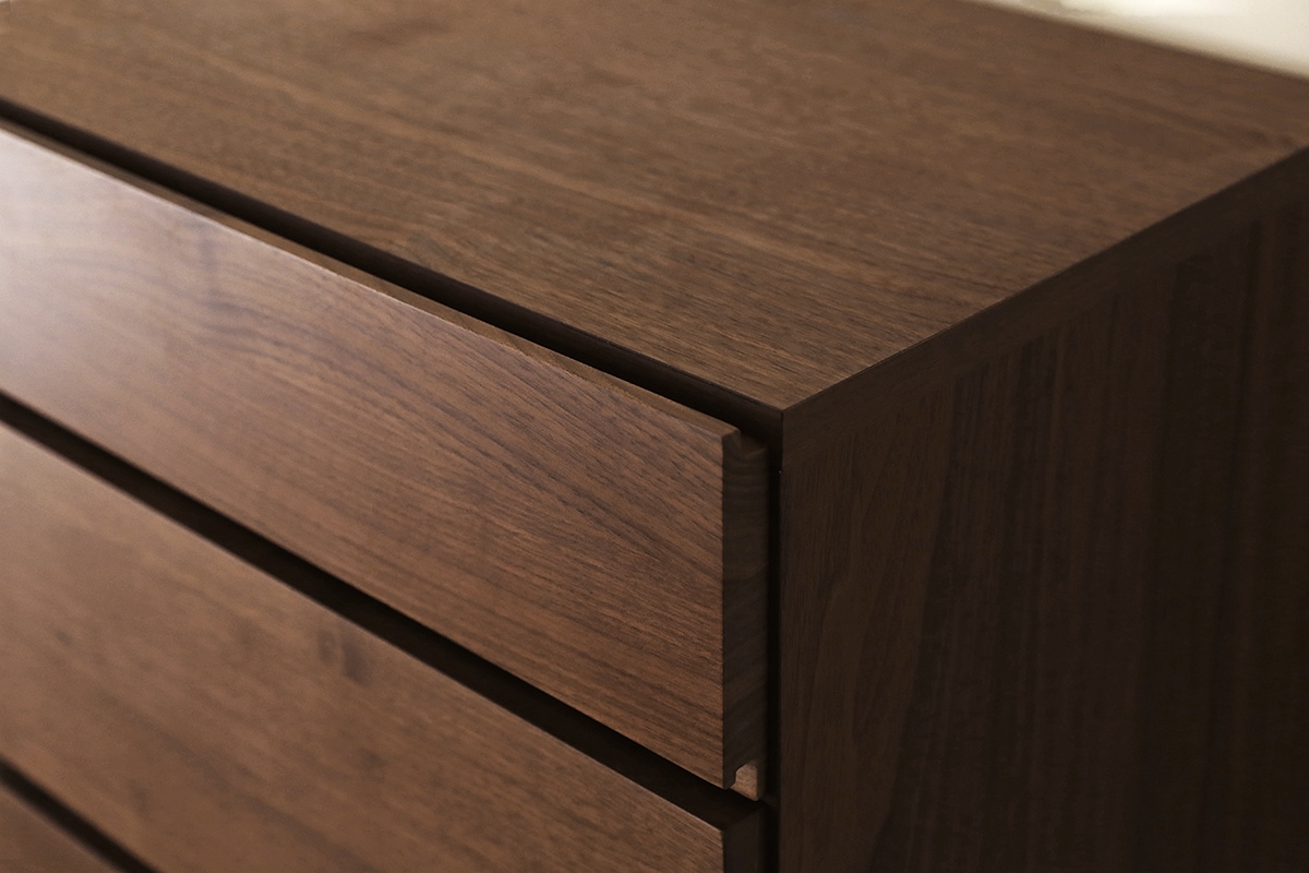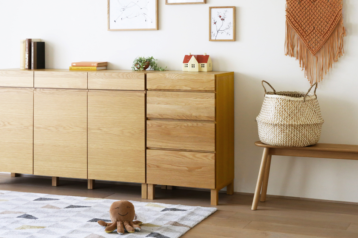 前板には無垢材、天板・側板には突板を使用し天然木の素材感溢れる仕上がりとなっています。