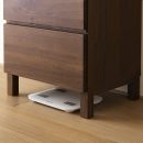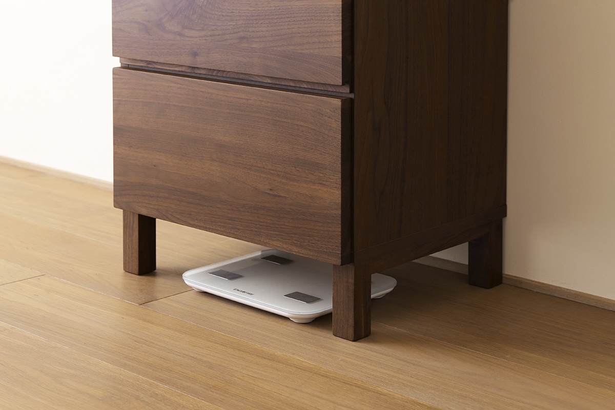 底には無垢材を使用した脚が付いています。脚高は10.8cmと自動お掃除ロボットも通過可能です。下部にスペースがあるので置き場所に難しい体重計やスリッパなどの収納にも役立ちます。