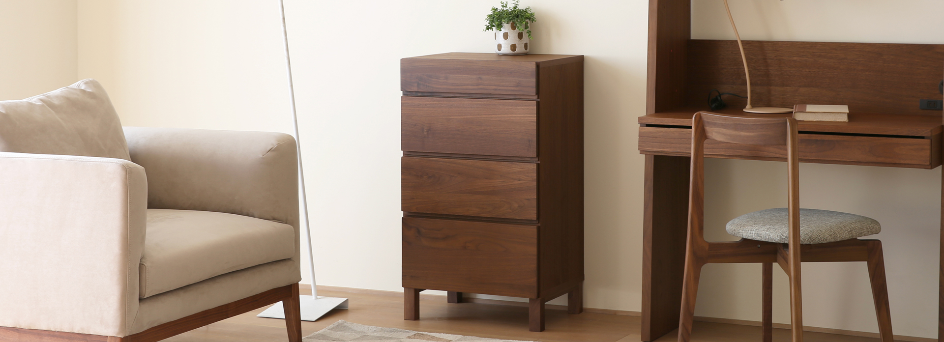 存在感を感じさせるウォルナットは、ブラックやブラウンなどのアイテムと相性がよく、モダンな落ち着いた雰囲気にぴったり。アイアンを使用したアイテムと組み合わせれば、空間がグッと引き締まり、長い時間を経たような趣のあるお部屋が完成します。