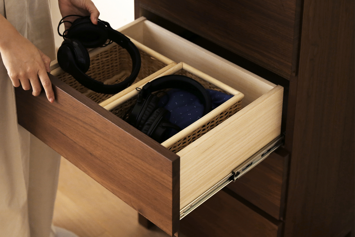 引出しは丈夫な「箱組み」仕上げです。それぞれ深さの異なる引出しを4杯設けているためさまざまな収納物に対応します。