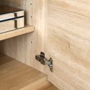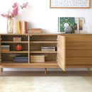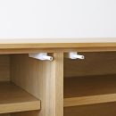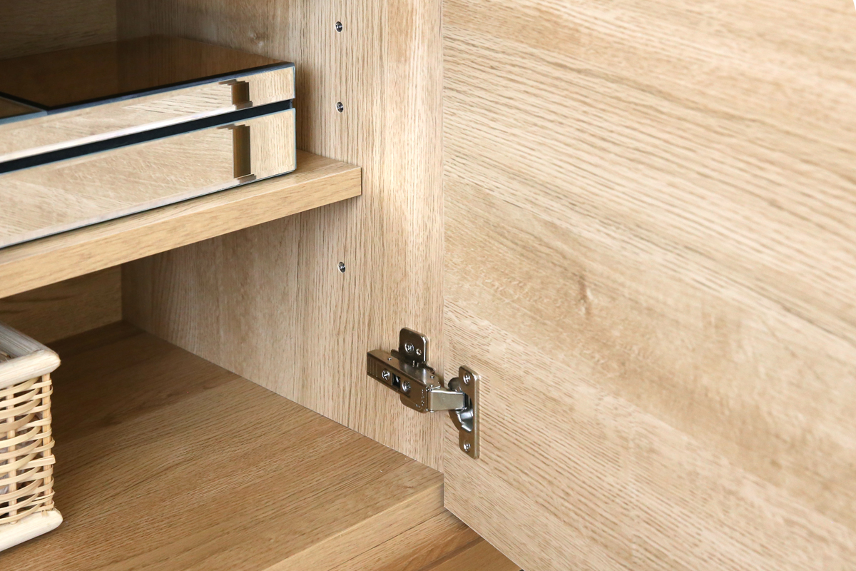 サイドボードの扉はプッシュ式になっており、取手がなくすっきりとした見た目に仕上がっています。扉内には4枚の可動棚が付属しており、6cmピッチで5段階の高さ調節が可能です。収納する物に合わせて高さを変更できて便利です。