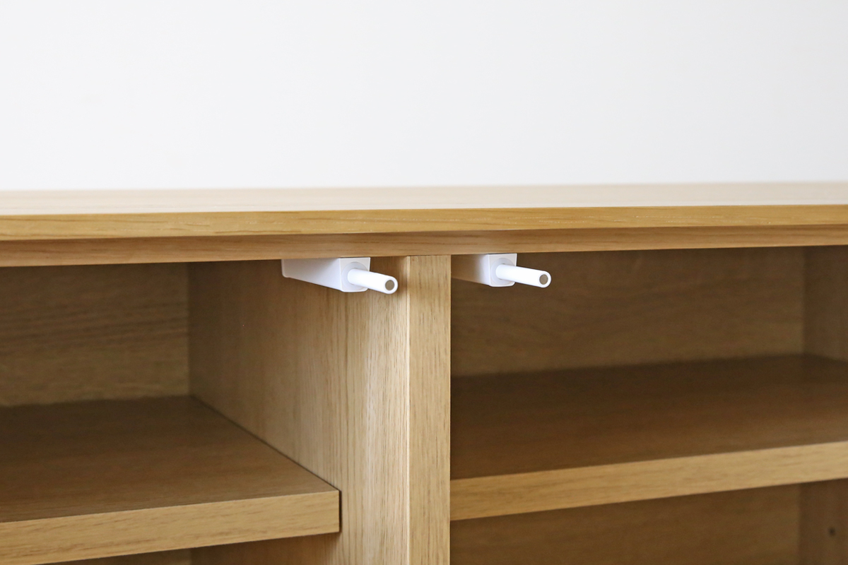 背面にはプリント化粧板を使用。背面に排熱タイプの配線孔を設けました。 デッキ内にこもりがちな機器から発する熱を逃がす効果もあります。素材感はそのままに見えない部分にまで気を配った仕上りになっています。