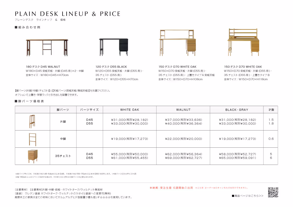 PLAIN DESK 片脚パーツ 天板奥行き 55~70cm用 OAK 天板 D55〜70cmに使用。 【素材】 天板:無垢 【塗装】 ウレタン塗料(オイル塗装への変更可) ※オーク・ウォルナットのみ 【価格】 税込¥33,000 ご注文より6週間後の出荷です。 (長期連休前のご注文はお問合わせ下さい。) >>小冊子はこちら >>公式ウェブショップはこちら