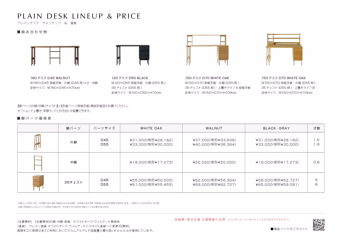 PLAIN DESK 35チェストパーツ 天板奥行き 55~70cm用 WALNUT 天板 D55〜70cmに使用。 【素材】 天板:無垢 【塗装】 ウレタン塗料(オイル塗装への変更可) ※オーク・ウォルナットのみ 【価格】 税込¥69,000 ご注文より6週間後の出荷です。 (長期連休前のご注文はお問合わせ下さい。) >>小冊子はこちら >>公式ウェブショップはこちら
