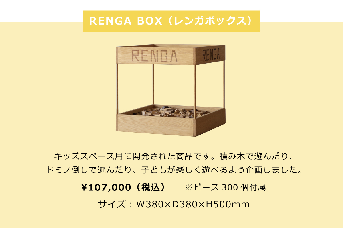 「RENGA BOX」は、キッズスペース用に開発された商品です。積み木で遊んだり、ドミノ倒しで遊んだり、子どもが楽しく遊べるように企画いたしました。