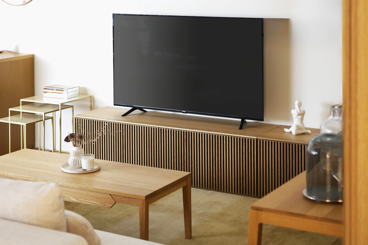 ローボードを並べても、リブの隙間が均一で美しいです。素材を合わせたコーディネートで備え付けのような一体感があります。