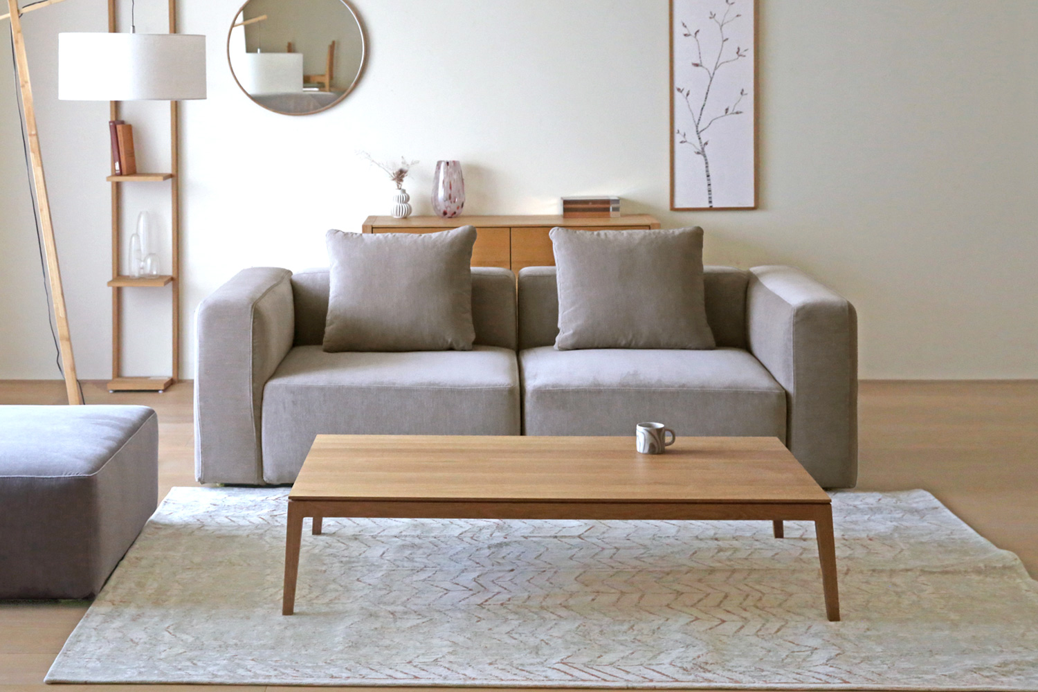 長時間過ごすことの多いソファは、飲み物をこぼしたり、食べこぼしが気になることもあります。毎日使うものだからこそ衛生面にも配慮し、簡単にお手入れできるフルカバーリング仕様を採用しました。ベージュとグレーはドライクリーニング対応、ライトグレーは洗濯機でのお手入れが可能です。