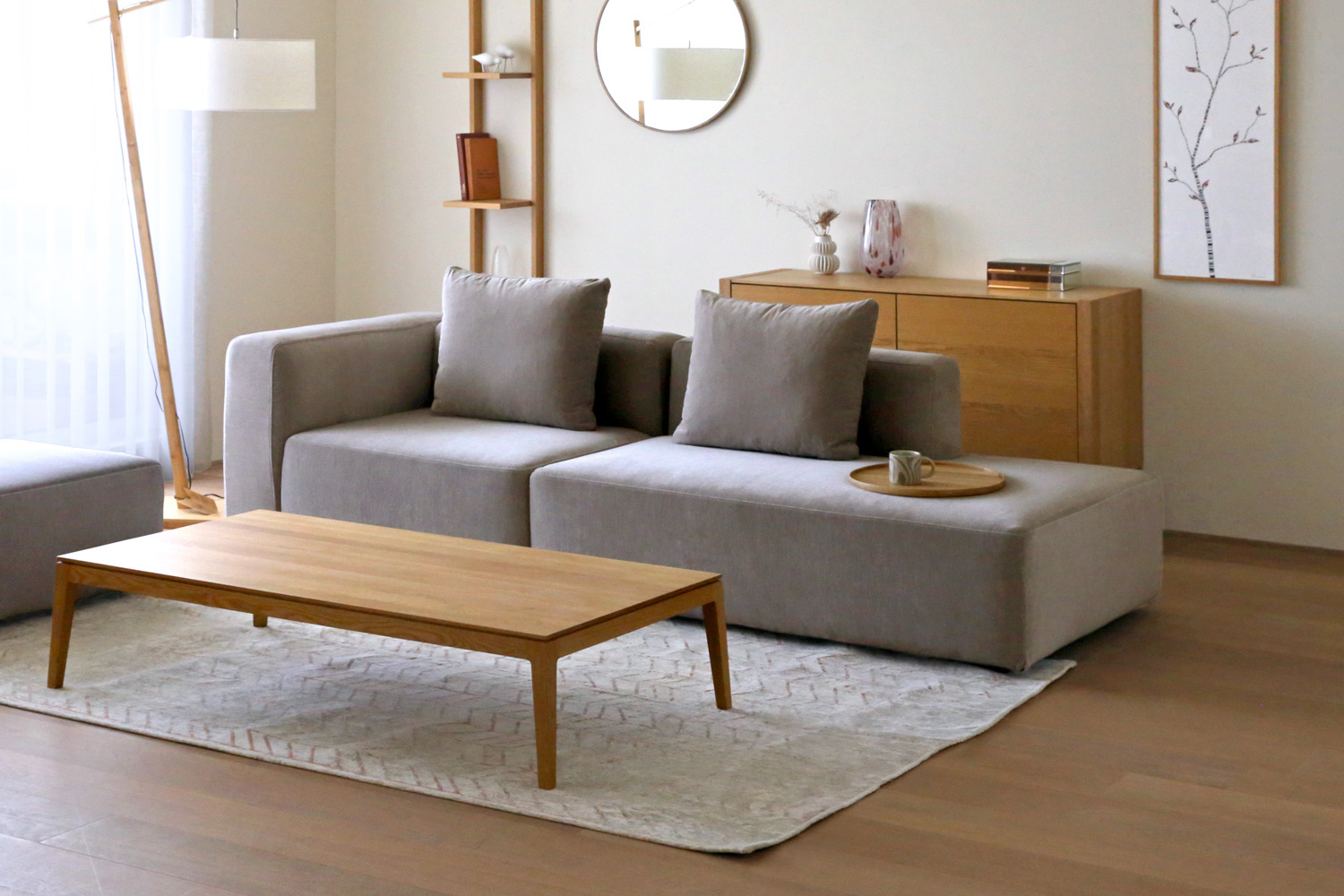 SUMOWAは、1人掛けや2人掛け、シェーズロング、コーナー、オットマンなどのモジュールで構成されているソファです。単体でも使える汎用性と、自由に組み替えられるモジュール式ならではの柔軟さが魅力。パーツの追加も可能で、模様替えや引越しにも対応します。
