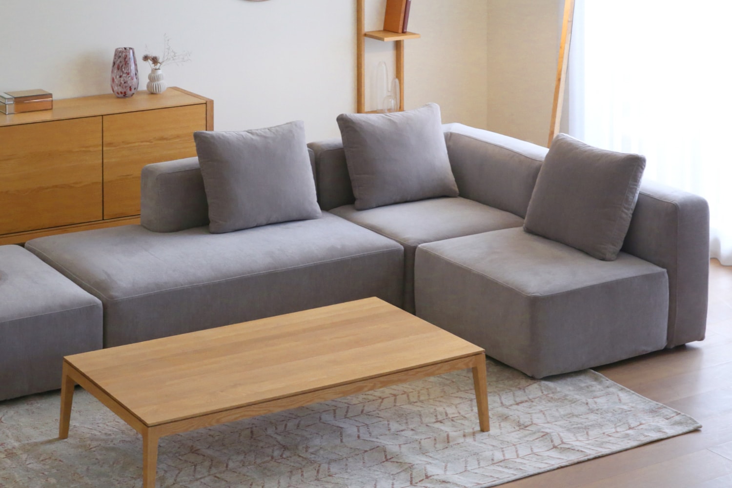 長時間過ごすことの多いソファは、飲み物をこぼしたり、食べこぼしが気になることもあります。毎日使うものだからこそ衛生面にも配慮し、簡単にお手入れできるフルカバーリング仕様を採用しました。ベージュとグレーはドライクリーニング対応、ライトグレーは洗濯機でのお手入れが可能です。