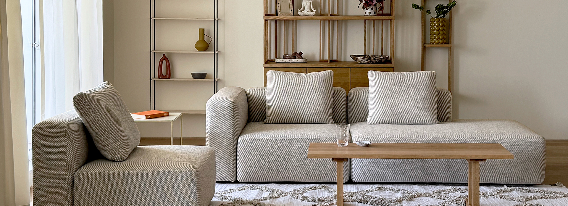 コーナーソファは、「L字形」のレイアウトをつくるためのパーツです。空間の角を有効活用でき、ソファ全体を囲むような配置が可能です。※コーナーソファは、生地の縫い目の向きが左右で異なり、見た目が変わります。設置時の向きに合わせて、正面から見て「左」「右」をお選びください。
