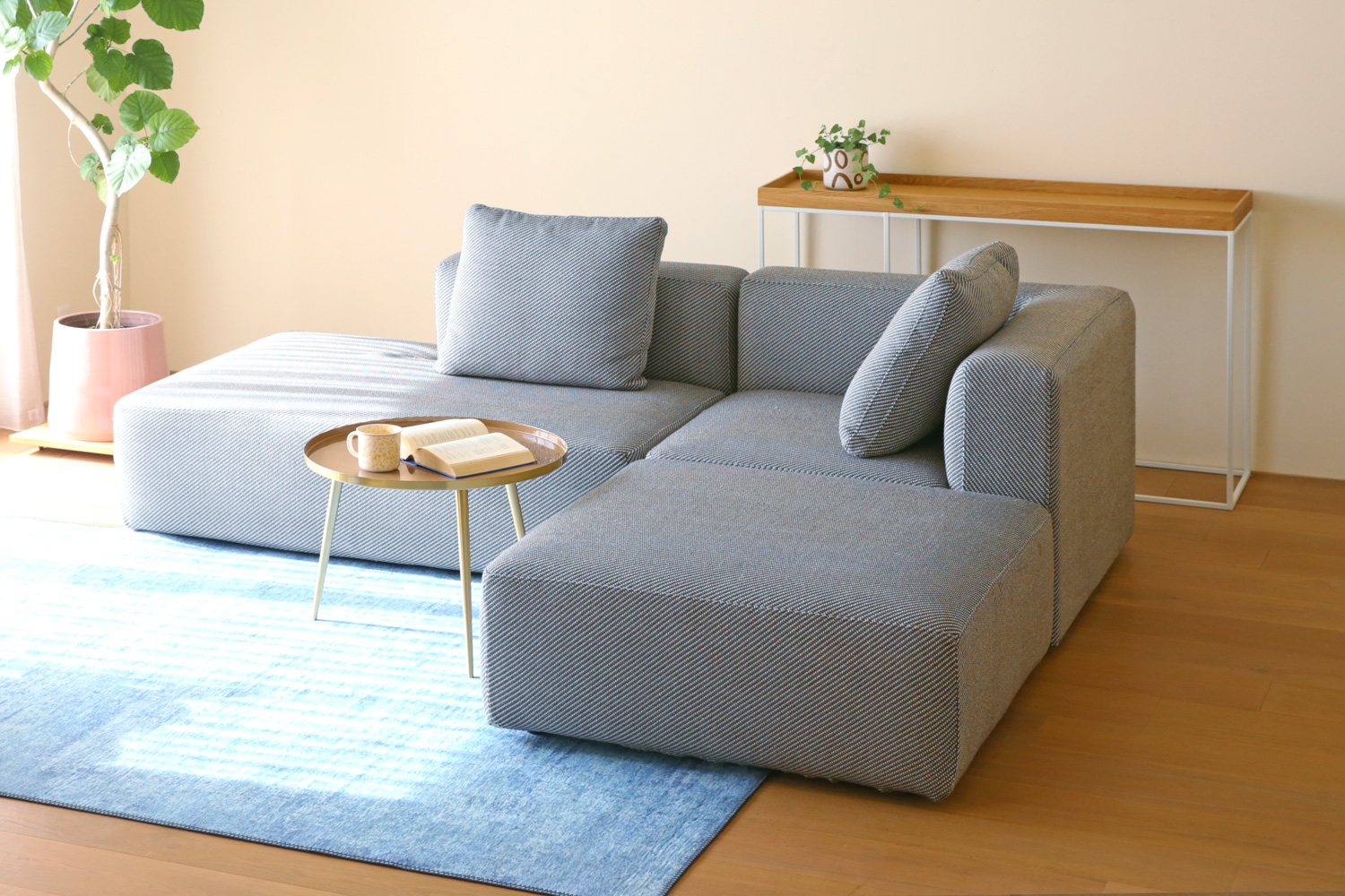 コーナーソファは、「L字形」のレイアウトをつくるためのパーツです。空間の角を有効活用でき、ソファ全体を囲むような配置が可能です。※コーナーソファは、生地の縫い目の向きが左右で異なり、見た目が変わります。設置時の向きに合わせて、正面から見て「左」「右」をお選びください。