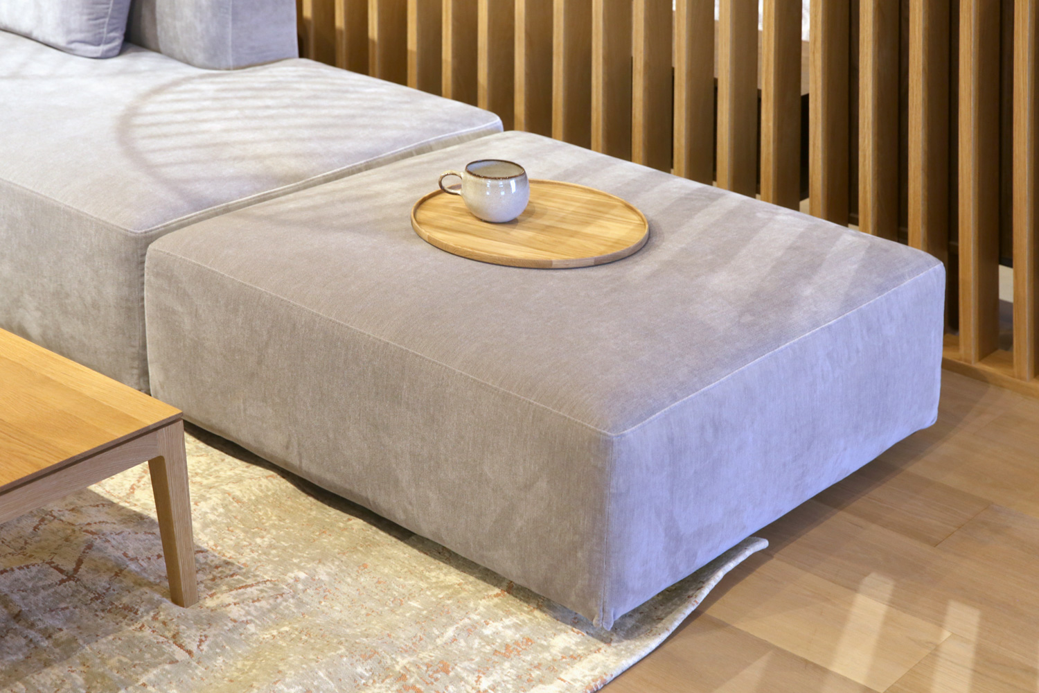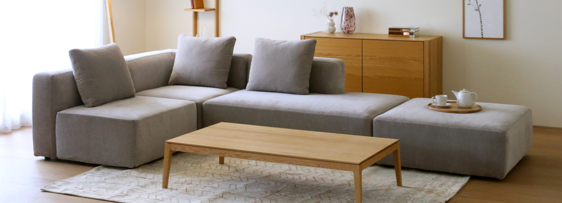 シリーズにプラスすることで、さらに贅沢なくつろぎ時間が過ごせるオットマン。心地の良い足置きとしてはもちろん、そのまま寝転がったり、来客用のスツールとして使えたり、センターテーブルとしても活躍したりと、その使い道は様々。「大きなソファーには憧れるけれど、模様替えや引っ越しが多くていつまで使えるか不安」という方でも、取り回しの良いオットマンなら、暮らしの形に合わせて長くお使いいただけます。
