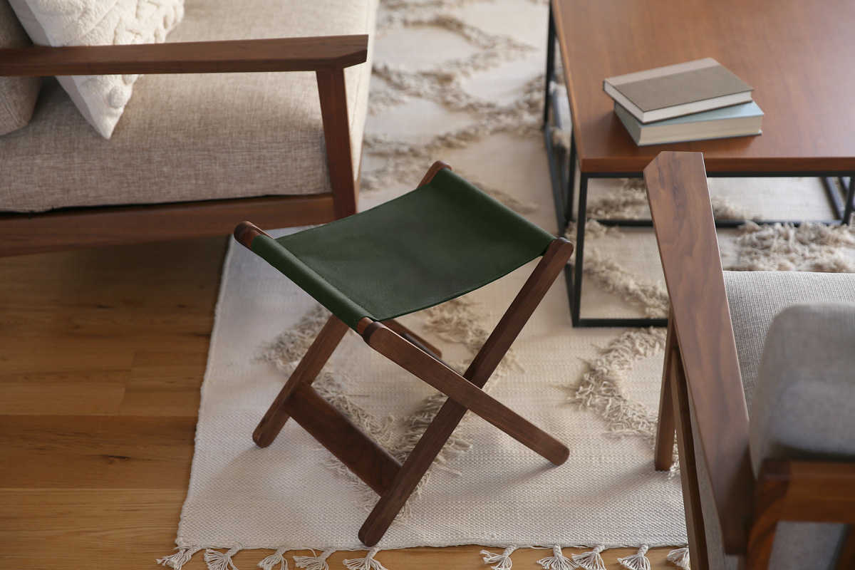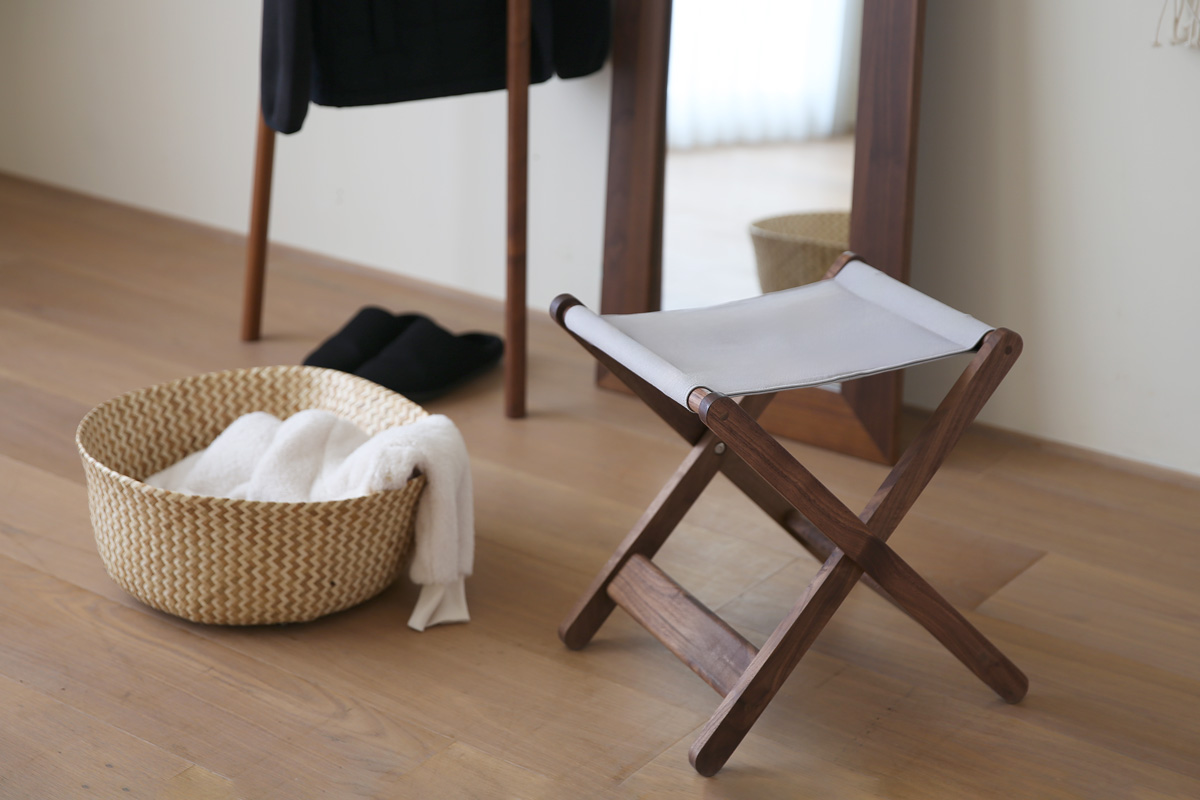 いろんな場所で、暮らしに合わせて活躍してくれる便利な折りたたみスツール。座面には帆布を、フレームは無垢材の素材感をそのまま楽しめるシンプルなつくりで、どのようなインテリアにも自然になじみます。お部屋の中にひとつあるだけであちこち便利に使える、心強いアイテムです。