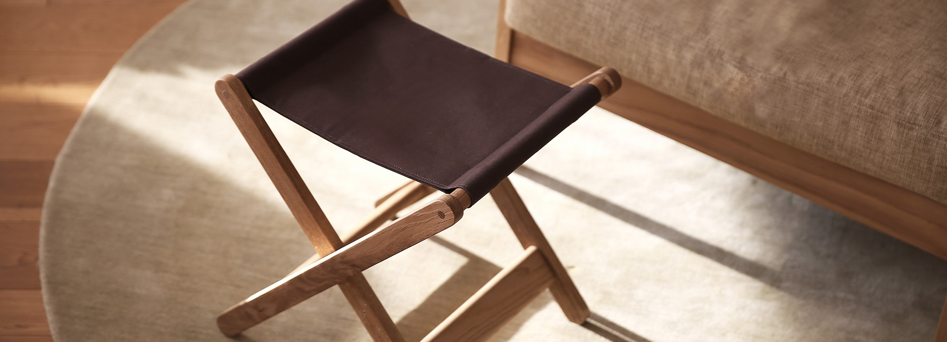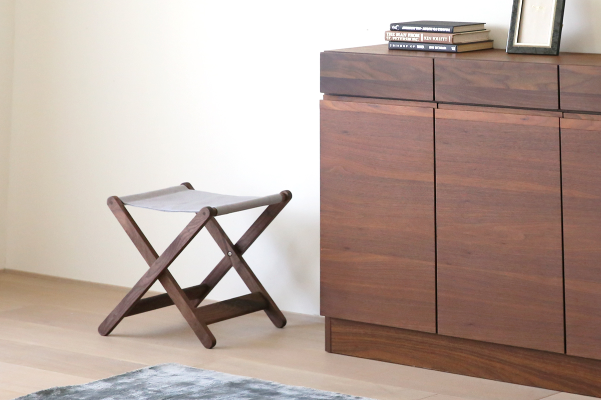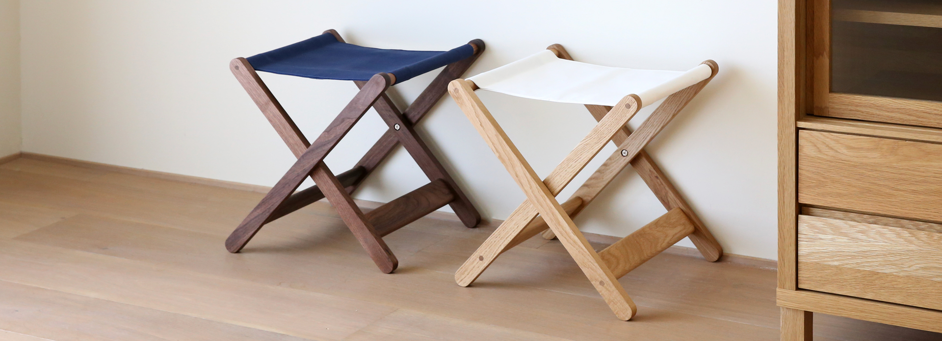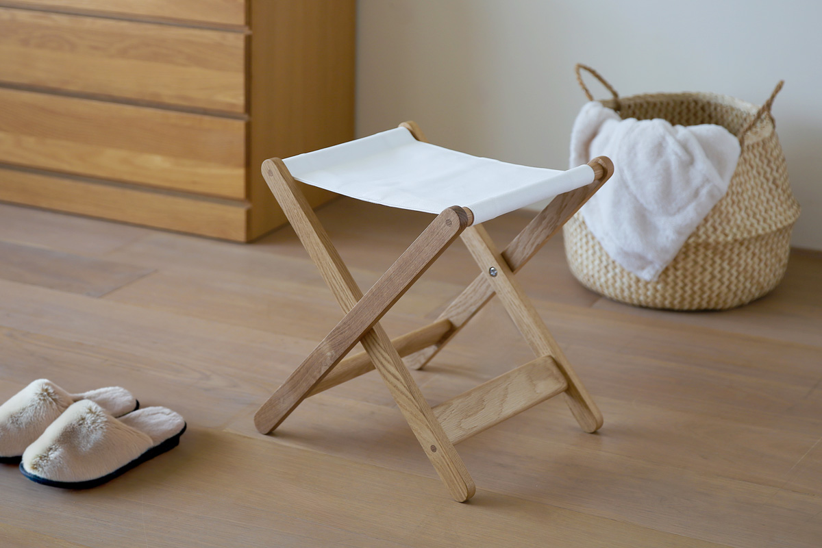 いろんな場所で、暮らしに合わせて活躍してくれる便利な折りたたみスツール。座面には帆布を、フレームは無垢材の素材感をそのまま楽しめるシンプルなつくりで、どのようなインテリアにも自然になじみます。お部屋の中にひとつあるだけであちこち便利に使える、心強いアイテムです。