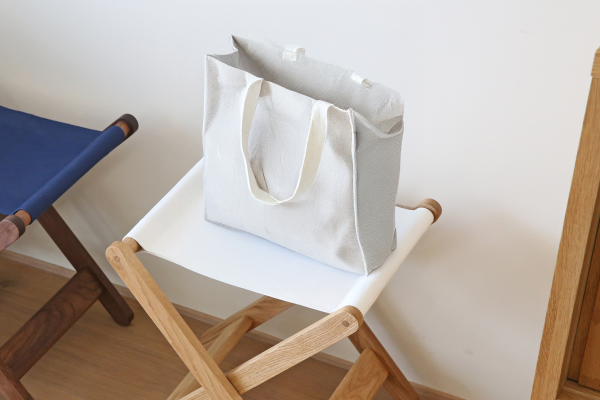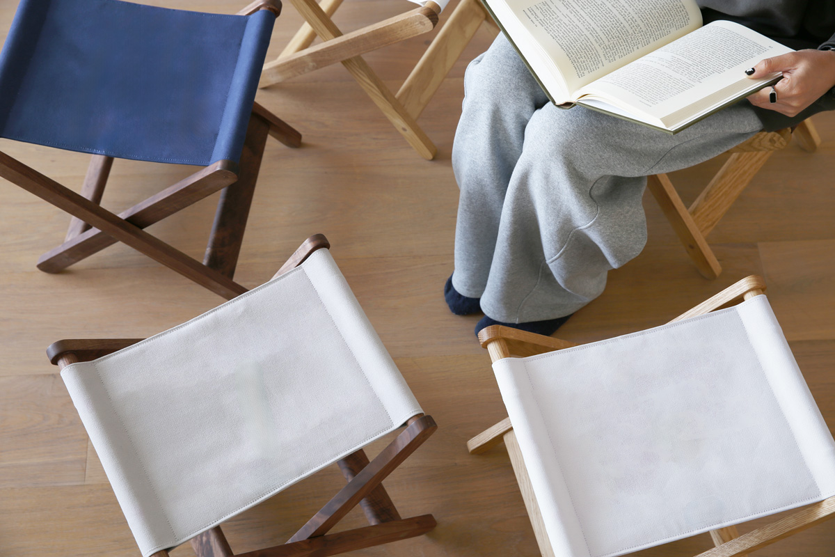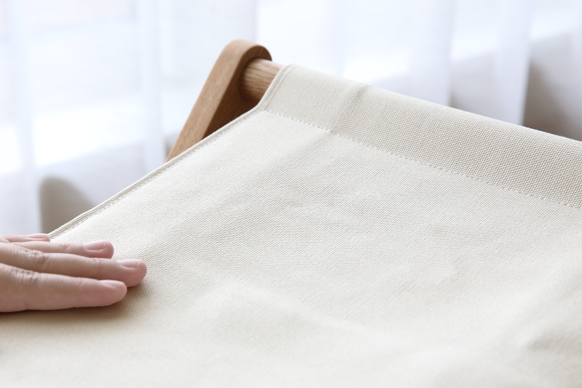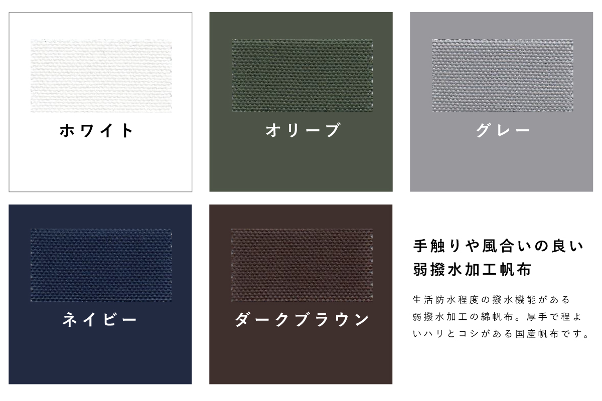 座面に使用している帆布は、目の詰まったしっかり丈夫な生地で、お尻に優しく安定感のある座り心地です。生活防水程度の撥水機能がある弱撥水加工生地です。ホワイト、オリーブ、グレー、ネイビー、ダークブラウンの5種のカラーバリエーションからお選びいただけます。